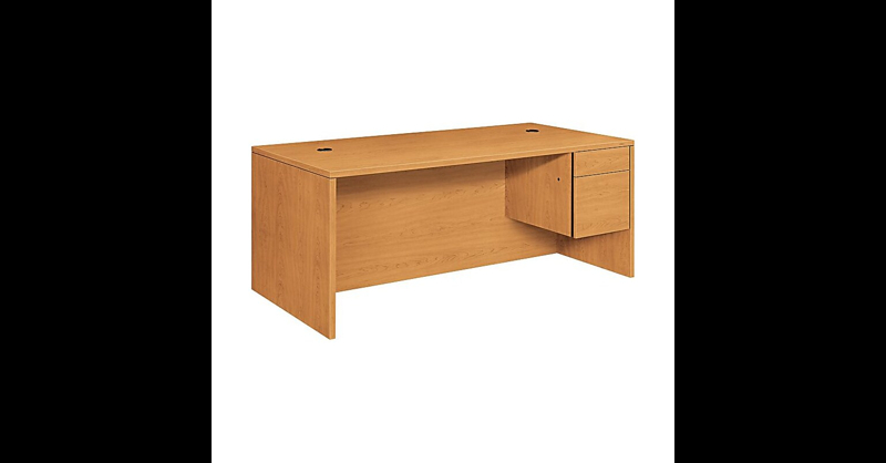 The best built laminate desk in its price class. 29 1/2"H x 72"W x 36"D. Harvest finish. A rugged, high-quality desk collection for any organization seeking maximum performance for the price. Woodgrain, solid and patterned surface materials in over 90 combinations let you customize your office environment. Premium, multi-ply laminate stands up to scratches, spills, stains and boiling liquids, and holds up under heavy use. Metal-to-metal fastening system for precise fit and unsurpassed durability. Durable inner-frame construction stands up to the stress of frequent moving and relocation. Concealed drawer handles for an uncluttered look. The formal, full-height modesty panel provides privacy below the worksurface. Robust construction using metal-to-metal fasteners and wood dowels for a solid feel and lasting performance. Hard-working, good-looking and built to survive a lifetime of overtime. Durable abrasion- and stain- resistant laminate. Drawers operate on ball bearing suspensions. File drawers extend fully and accommodate letter or legal size hanging files, box drawers extend three-quarters. 10 1/2" conference overhang provides kneespace for guests. Fully Assembled. HON Full Lifetime Warranty. Model Option: H10585R. CC.