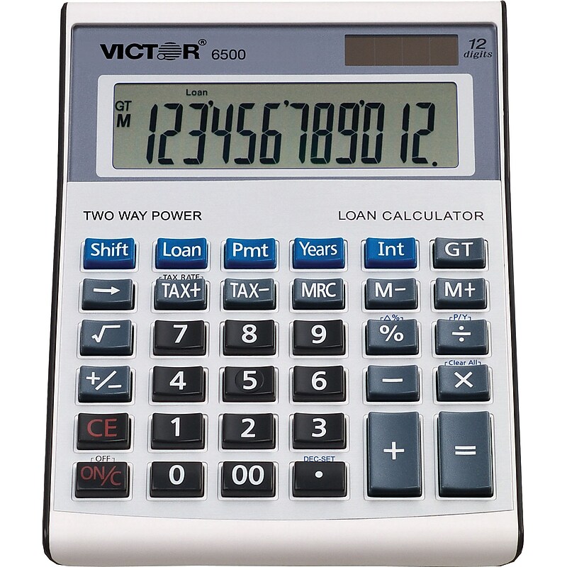 Victor VCT-6500 Loan calculator has a 1-line display and carries out all loan calculation functions. Calculator is ideal to use for business applications. Loan Wizard feature inputs 3 variables to compute the fourth. Extra-large 12-digit, 1-line angled display. Automatic tax keys, selectable decimal, square root key, grand total key, percent key, 3 key independent memory, change sign key, backspace key, delta percent and automatic power down. Operates on hybrid power (solar/battery backup). 2 year warranty. Smooth touch keyboard and brushed metal faceplate. The loan wizard helps you effortlessly answer any loan question (simply input any three loan variables to compute the fourth, you also have the option to change payment periods per year). Perfect for desktop use either at home or in the office. Perfect for desktop use either at home or in the office.