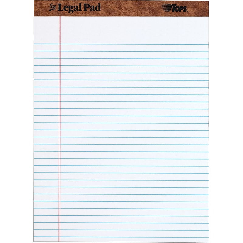 The classic format long preferred by attorneys and professionals gives you quick access to notes and lists. Smooth perforated sheets detach easily for a tidy, organized notebook . Proudly made in the USA. 8-1/2" 11-3/4". Legal ruled, 50 sheets. Standard weight paper. Legal Pad. 8-1/2" 11-3/4". 50 Perforated Sheets. 1 Each. Top Bound. Wide Ruled. Paper Weight: 15 lb. Chipboard Backing: 30pt. Made in the USA. TOPS The Legal Pad Writing Pad offers the ultimate value in reliable everyday legal pads for home or office.
