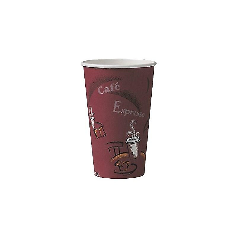 Stock up the lobby, the break room, or other space with these hot cups. With a capacity of up to ounces, these cups are ideal for filling with your morning coffee, tea, or another hot beverage, while the rolled rim allows for a lid to be attached securely. These Solo Bistro paper hot cups are lined with polyethylene, creating a moisture barrier that prevents leaking. Hot cups provide a heat barrier, so the cup is comfortable to hold and it is not too hot. Made of single sided poly paper withdesign. oz. capacity. Contains 300 hot cups per carton. Has a smooth rolled rim that gives rigidity to the cup and ensures a leak-resistant lid fit. Features Perfect Pak: up to 70% less than Solo's standard case count, ideal for limited storage space and low-volume turnover of single-use products. 90% plant-based renewable resources, making it environmentally friendly. Meets or exceeds SFI standard. Provide drink containers for customers, clients, and other guests with this 300-pack of Solo 16-ounce Bistro paper hot cups.