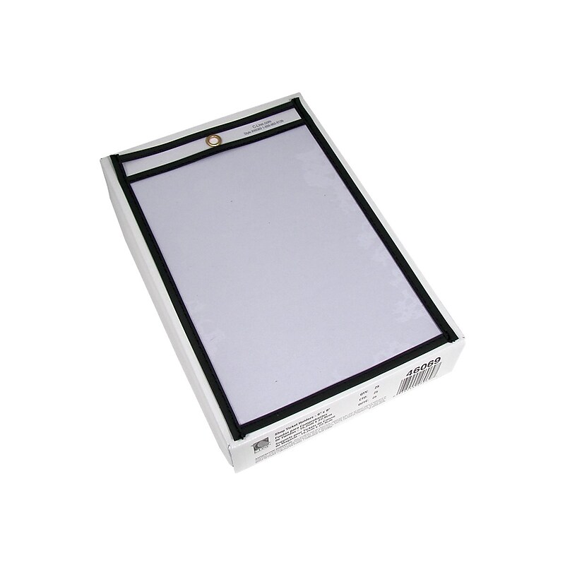 Assign repair work to inventory or customer orders with these C-Line vinyl job ticket holders. Reinforced stitched edges ensure long-lasting use, while thevinyl construction makes paperwork easy to read while shielding the pages from dirt and damage. Each of these C-Line vinyl job ticket holders comes with a top-mounted eyelet, so you can secure them to shelves with plastic ties or string. Stitched job ticket holder is perfect for storing and protecting work orders, production schedules, inventory cards, restaurant menus, and more. Clear vinyl construction with black stitching provides easy viewing from both sides. Stores and protects 6"W 9"L papers. 25 job ticket holders per pack. Stitched, super heavyweight graded job ticket holder with short-side load orientation and convenient eyelet at top for hanging. Store work orders, pricing sheets, or repair requests in these C-Line 6 9-inch vinyl job ticket holders.