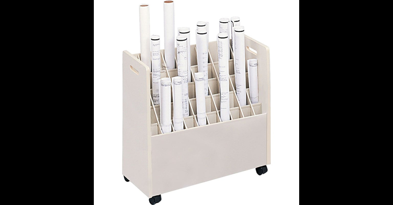 This Safco mobile roll file can hold multiple paper rolls of different lengths, so you can easily organize and categorize your office supplies and finished projects. Mounted on sturdy casters, this unit rolls smoothly from room to room, making roll storage and access more convenient. This file's grandstand design makes it simple to view rolls and choose the size or type you need, and it includes 50 bins and two drawers so you can maximize office storage space. Mobile roll file includes two drawers and is recommended for storing multiple paper rolls. File hasvinyl laminate finish over durable wood-core construction for a clean and professional look. Dimensions: 28 7/8" x 30 1/8" x 15 3/4". Does not include lock. SAF3083. Easy assembly. 50 compartments. Sturdy wood-core construction in grandstand design, square tube openings. Textured putty vinyl laminate finish. 2" swivel casters for easy mobility. Safco Limited Lifetime Warranty. Tube size: 2-3/4x2-3/4"; 50 Tubes/file. Grandstand design for easy viewing. Cutout handgrips for easy transport. ⚠ WARNING: This product can expose you to chemicals including Di(2-ethylhexyl) phthalate (DEHP), which is known to the State of California to cause cancer or birth defects or other reproductive harm. For more information go to www. P65Warnings. ca. gov/furniture. Organize rolls and packaged paper in this Safco mobile roll file, which includes two file drawers for convenient storage.