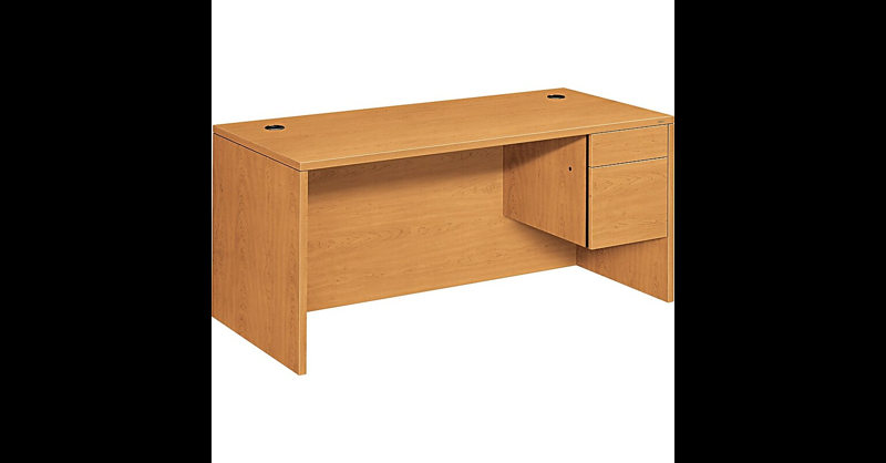 The best built laminate desk in its price class. 29 1/2"H x 66"W x 30"D. Harvest finish. A rugged, high-quality desk collection for any organization seeking maximum performance for the price. Woodgrain, solid and patterned surface materials in over 90 combinations let you customize your office environment. Premium, multi-ply laminate stands up to scratches, spills, stains and boiling liquids, and holds up under heavy use. Metal-to-metal fastening system for precise fit and unsurpassed durability. Durable inner-frame construction stands up to the stress of frequent moving and relocation. Concealed drawer handles for an uncluttered look. The formal, full-height modesty panel provides privacy below the worksurface. Robust construction using metal-to-metal fasteners and wood dowels for a solid feel and lasting performance. Hard-working, good-looking and built to survive a lifetime of overtime. Durable abrasion- and stain- resistant laminate. Drawers operate on ball bearing suspensions; file drawer extends fully and accommodates letter or legal size hanging files, box drawer extends three-quarters. HON "One Key" core removable locks make re-keying quick and easy. Full-height modesty panel for privacy. Fully Assembled. HON Full Lifetime Warranty. Model Option: H10583R. CC. The best built laminate desk in its price class.