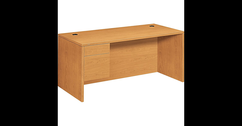 The best built laminate desk in its price class. 29 1/2"H x 66"W x 30"D. Harvest finish. A rugged, high-quality desk collection for any organization seeking maximum performance for the price. Woodgrain, solid and patterned surface materials in over 90 combinations let you customize your office environment. Premium, multi-ply laminate stands up to scratches, spills, stains and boiling liquids, and holds up under heavy use. Metal-to-metal fastening system for precise fit and unsurpassed durability. Durable inner-frame construction stands up to the stress of frequent moving and relocation. Concealed drawer handles for an uncluttered look. The formal, full-height modesty panel provides privacy below the worksurface. Robust construction using metal-to-metal fasteners and wood dowels for a solid feel and lasting performance. Hard-working, good-looking and built to survive a lifetime of overtime. Durable abrasion- and stain- resistant laminate. Drawers operate on ball bearing suspensions; file drawer extends fully and accommodates letter or legal size hanging files, box drawer extends three-quarters. HON "One Key" core removable locks make re-keying quick and easy. Full-height modesty panel for privacy. Fully Assembled. HON Full Lifetime Warranty. Model Option: H10584L. CC. The best built laminate desk in its price class.