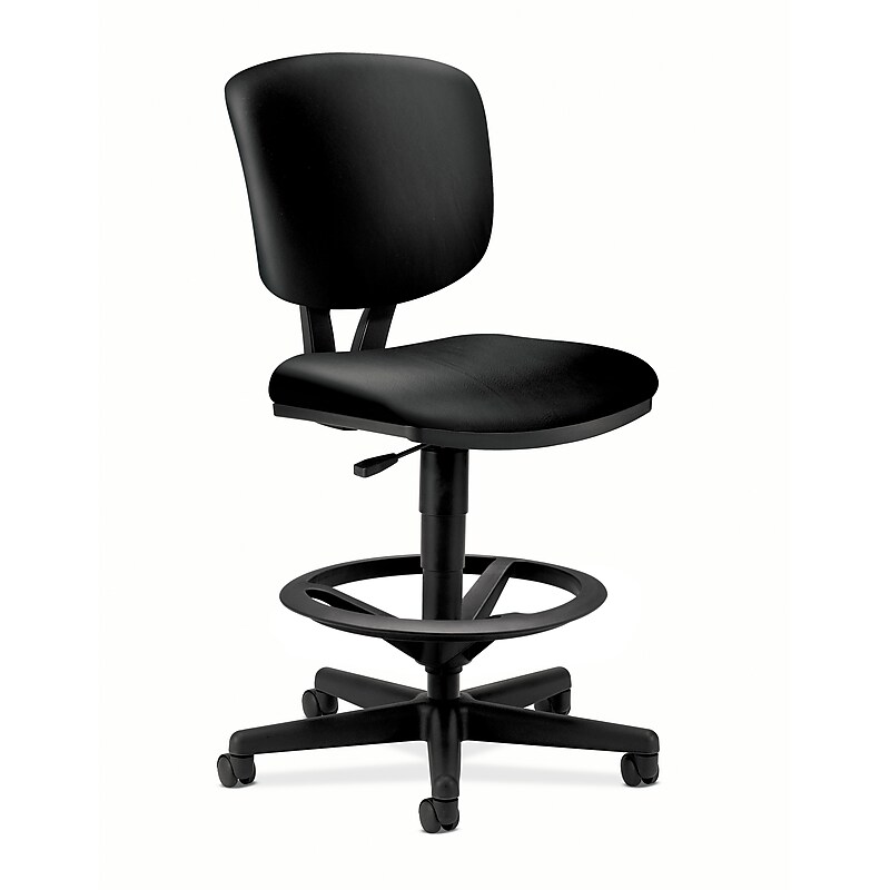 Relax while working when sitting in this extended-height task stool. Theleather upholstered seat and back are contoured to fit your body comfortably, and the stool swivels 360 degrees to reduce reaching and stretching. This HON Volt leather task stool has an adjustable foot ring, so you can rest your legs. Computer and desk stool to enhance the look of your personal or commercial space. Black SofThread leather cushioned seat is easy to clean with a damp cloth. Pneumatic gas-lift height adjustment allows you to customize the chair to your specific needs. Overall dimensions: 49. 88"H x 27"W x 29. 5"D. Seat dimensions: 19"W x 20"D. Height from Floor: 22-7/8" to 32-3/8". Back Size Width: 16-1/2". Footring size: 19. 45" Dia. Armless design allows for easy movement and versatility. Weight is rated up to 250 lbs. Assembly required. Lifetime manufacturer limited warranty. Certifications & Standards: ANSI/BIFMA. Model Option: H5705. SB11. T. Work in comfort on this extended-height HON Voltleather task stool.