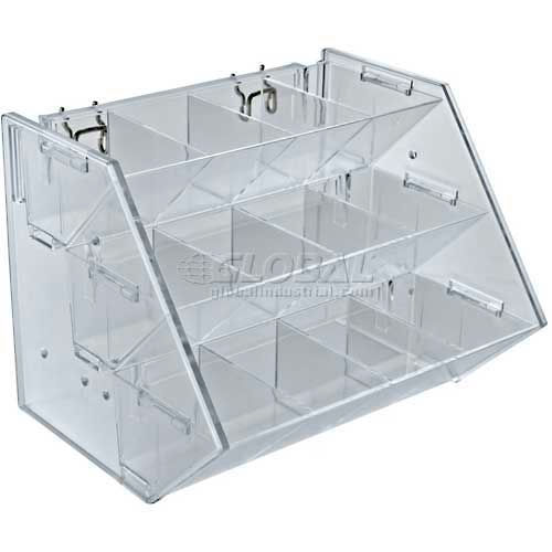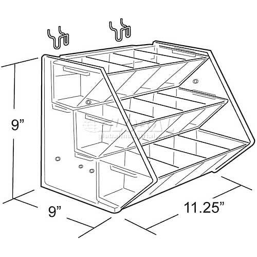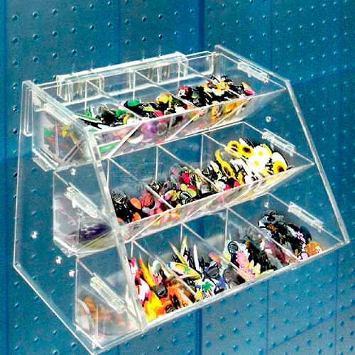Wide High Deep 3-Tiered, 12-Compartment Acyrlic Tray. For use on countertops, pegboard or slatwall. Includes 2 metal U-hooks.