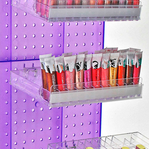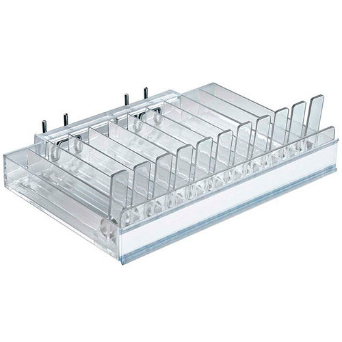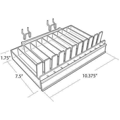 Eleven-compartment lipstick tray W x7.5" D x H. Each slot measures .8125" x 5.5"D. This molded acrylic display tray includes a FLIP-UP C-Channel for insertion of UPC codes! Attach to slatwall or pegboard counter displays, floor displays, or wall displays, two U-hooks included. Works well with line of pegboard and slatwall displays. You can also choose to add the c-channel option to add marketing to the front.