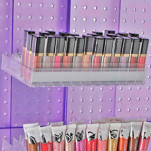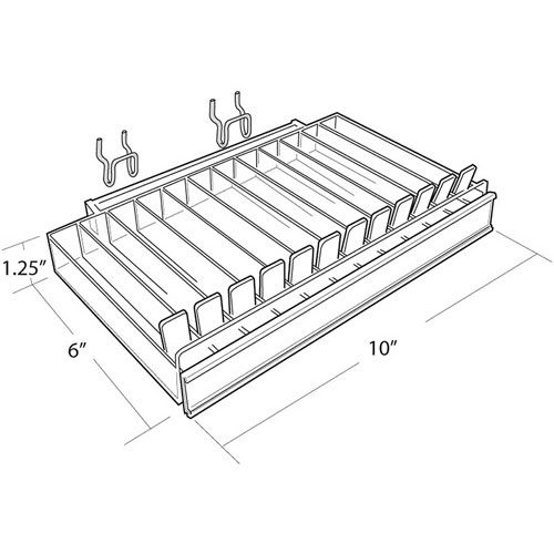 Twelve compartment lipstick tray measures W x D x H. Each slot measures .75". Choose to use this acrylic tray as a cosmetic display for lipstick or for any small product.