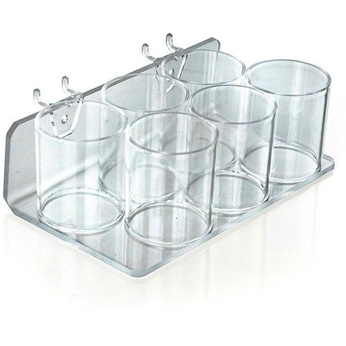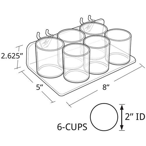 Six-cup display measures 8"W x 5"D x 2.625"H. Each cup measures 2.5"H and 2" in diameter. Use this display on pegboard, slatwall, or counter top. Two plastic hooks attached for easy mounting.