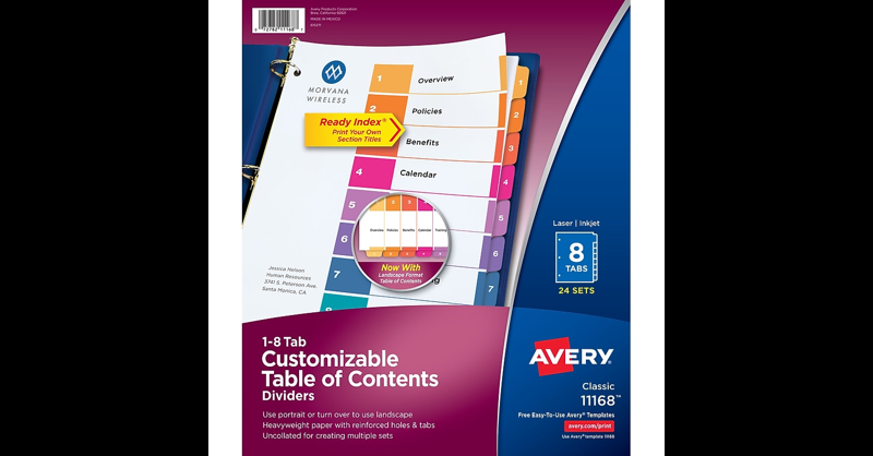 Organize your projects in moments with Avery Ready Index 8-tab dividers. Each tab is preprinted and uniquely color coded for a professional appearance. Print your own custom section titles and images onto the table of contents sheet without worrying about labels or inserts. Whether you're creating planners for classes or hosting a presentation, these dividers are ideal for getting everything sorted. 24 sets of 8 tabbed dividers are included with each sheet measuring 8-1/2"x11". The 3 binder holes are reinforced on both sides of the heavyweight sheet to prevent creasing and tearing. Each divider tab includes additional reinforcement along the edge of each page to distribute stress and resist folding. The printable table of contents is dual compatible with both laser and inkjet printers. This sheet can also be printed in either portrait or landscape so that your projects can be displayed in any orientation. Just flip the sheet to view the other layout on the opposite side. Try out free templates for these dividers and check out the Avery Design & Print software at avery. com/templates. Keep track of your tab dividers quickly and easily with the printable table of contents sheet. Add graphics, logos and titles to the table of contents page with free templates at avery. com/templates. 24 sets of 8 dividers are included with sturdy tab and hole reinforcements on both sides. Reinforcedtabs are preprinted and don't require inserts or labels. Versatile design works in either portrait or landscape orientation and is great for project binders and training manuals. Securely insert the 3 hole-punched paper dividers into your favorite 3 ring binder. The page dividers' table of contents is both inkjet and laser printer compatible. Stay organized and enjoy a professional binder appearance suitable for any work or home office with the uniquely color-coded tabs. Avery Ready Index table of contents dividers are great for organizing reports and presentations.