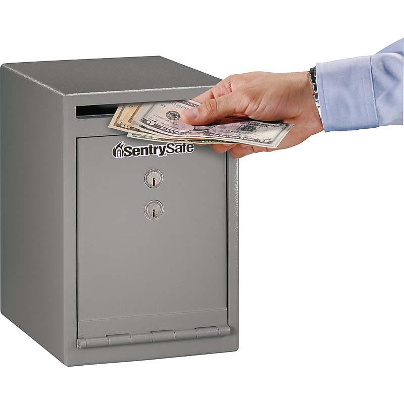 Sentry Safe . 39 cu. ft. Drop Slot Safe. Dual key lock. 39 cu. ft. Drop Slot Safe. Solid steel construction. Bottom side piano hinge. Bolt-down kit included, pre-drilled anchor holes. Color: Gray , Durable powder coat finish. Smart way to protet your retail business, your employees and your customers.
