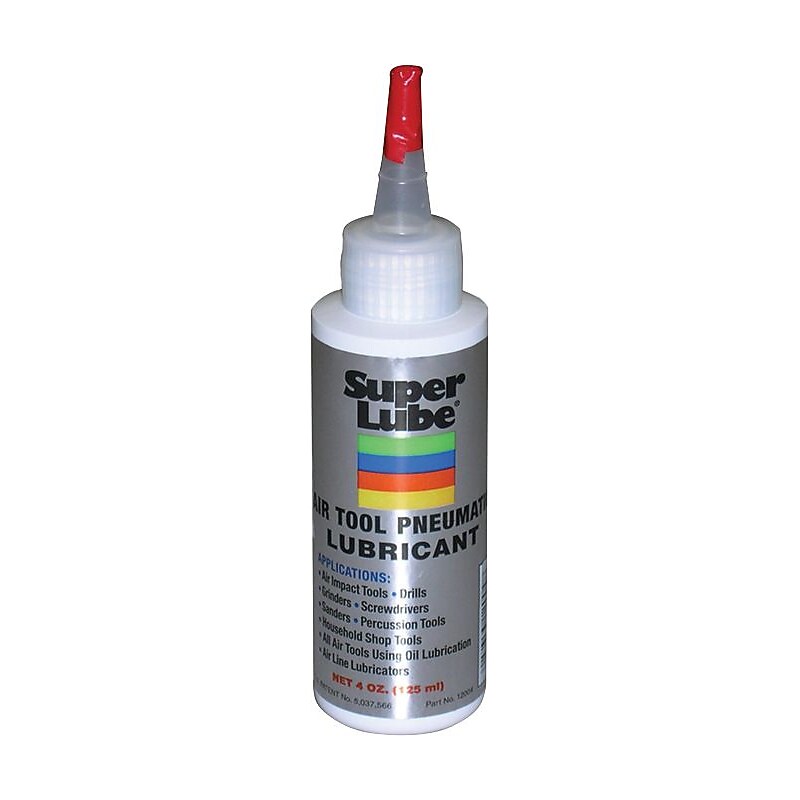 Super Lube Pneumatic Air Tool Oil Lubricant minimizes tool wear. Container type: Bottle. Container size: 4 oz. Form: Oil. Air tool pneumatic lubricant can be used on all air tools using oil lubrication. It absorbs water and eliminates any ice buildup and frost in air tools. A blend of rust and corrosion inhibitors and a special base fluid oil minimizes tool wear. For pneumatic tools.