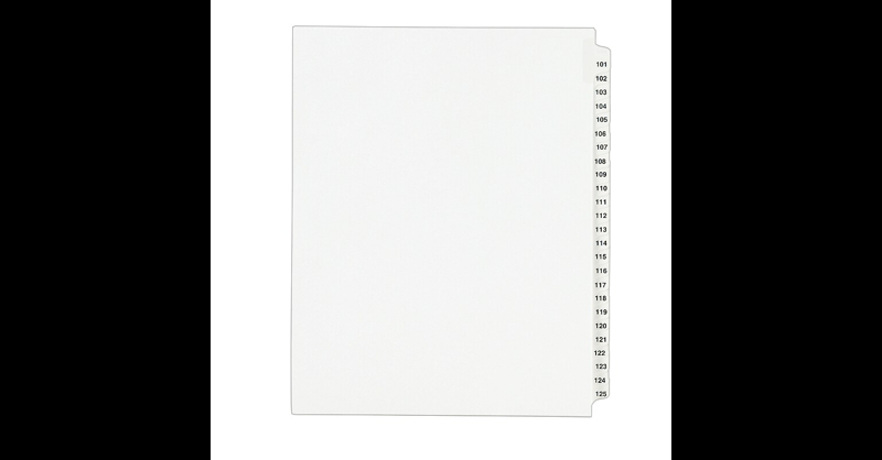 You have the right to organized and professional-looking files. This Standard Collated Legal Divider Set features Tabs 101-125 so it's perfect for index briefs, legal exhibits, mortgage documentation files and more.paper stock with clear, Rip Proof(TM) reinforced tabs are preprinted on both sides using Helvetica bold type for ease of use, and the unpunched binding edge gives you the freedom to fit practically any binding system. Here's evidence these dividers will do your files justice. Perfect for Index briefs, legal exhibits, and mortgage documentation files. Unpunched binding edge so indexes can fit practically any binding system.paper stock dividers feature clear RipProof reinforced side tabs. Side tabs are printed with Avery Style (Helvetica Bold typestyle) on both sides. Letter Size, 101-125. Get files in order with this set of Avery standard collated letter-size 101-125 tab legal dividers.