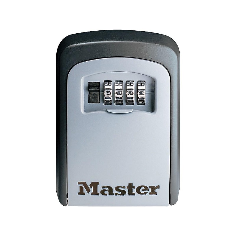 Protect keys from loss or theft with this locking combination steel box. A four-digit dial lets you set your own combination, while the wall-mount-ready design makes it easy to give this lock box permanent placement. With a large internal cavity, this Master Lockand silver steel box provides storage for up to five keys without jamming or sticking. Key combination safe adds higher security to protect important keys. Made from metal. Can hold up to five keys. Dimensions: 4. 75"H x 3. 25"W x 1. 5"D. Secure keys to your property with this Master Lockand silver locking combination five-key steel box.