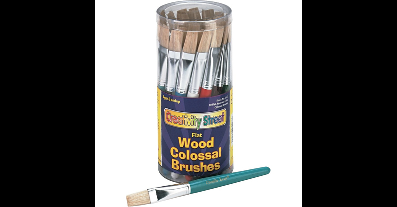 Creativity Street Colossal Brushes 5167, Flat, Assorted Colors, 7-1/4" Long, 30 Count. Great big brushes are perfect for small hands, allowing young artists better control and they hold lots of paint. Assorted colors. 30 brushes per durable plastic canister. Flat Brushes.