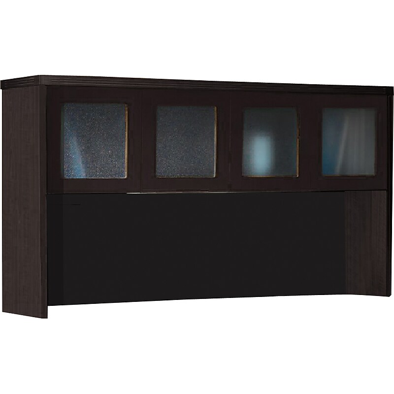 Safco Aberdeen Series 39 1/8" Laminate glass door hutch color has textured tempered glass that highlights cabinet contents and includes 4 cabinet-style doors with self-closing hinges. Textured tempered glass highlights cabinet contents while providing privacy. Dimensions: 39 1/8"(H) x 72"(W) x 15"(D), 15"(H) x 33 3/4"(W) x 14"(D) compartment. 2 compartments. Edge detail profile: 4 mm fluted PVC edge detailing. 21 1/2" clearance between work-surface and bottom of shelf. For use with Safco Aberdeen series credenza shell, Safco task light. Glass tampered for safety and durability. Back panel features two cable grommets. Four cabinet styled door with self-closing hinges. ⚠ WARNING: This product can expose you to chemicals including Di(2-ethylhexyl) phthalate (DEHP), which is known to the State of California to cause cancer or birth defects or other reproductive harm. For more information go to www. P65Warnings. ca. gov/furniture.