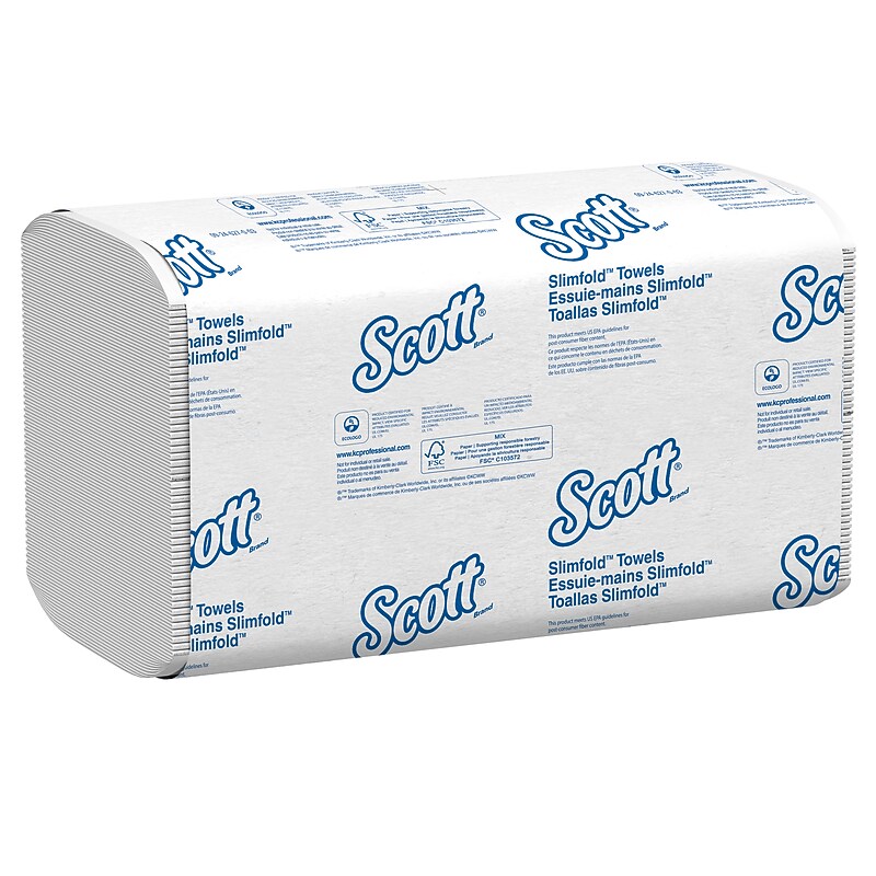 Wipe up messes or dry hands with these paper towels. The five-fold design conserves space on counters and tables and provides easy dispensing, while the built-in absorbency pockets soak up moisture to leave surfaces clean and dry. These paper towels are packaged in 90-sheet bundles, allowing for easy distribution throughout your building. With a crisp,color, these Scott Control Plus+ Slimfold paper towels offer a clean look for use in offices, schools, and medical facilities. Slimfold towels for drying hands or cleaning up messes. 90 sheets per pack, 24 packs per carton (2160 sheets total). 1-ply thickness. White sheets look clean and sanitary. Eco-friendly choice with at least 40% post-consumer content. Made of 50% recycled materials. The unique fold is compactly folded five times (much more than typical tri fold, m fold or c fold towels), but unfolds to 7. 5 x 11. 6, so youll have enough area for thorough hand drying. Meets or exceeds EcoLogo and FSC standards. Keep public restrooms, kitchens, and other public spaces stocked with these Scott Control Plus+ Slimfold paper towels.