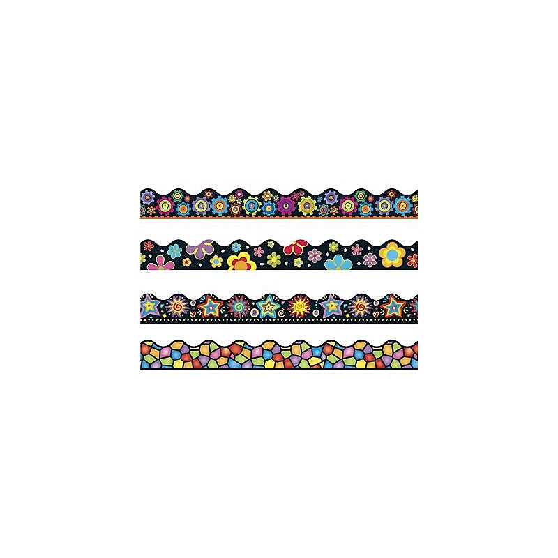 Trend Enterprises Scalloped Terrific trimmer in patterns theme measures 39' x 2 1/4" and is ideal for ages 3 - 15 and grades preK 9th. Terrific trimmer includes brights ongears, neon bursts, stained glass and flower power. Brightly colored designed borders. Pre-cut with scalloped border edges. Dimensions: 2 1/4" x 39'. Brights onterrific trimmers variety pack with four popular designs in one pack makes it easy to create eye-catching displays of student work and frame bulletin board sets.
