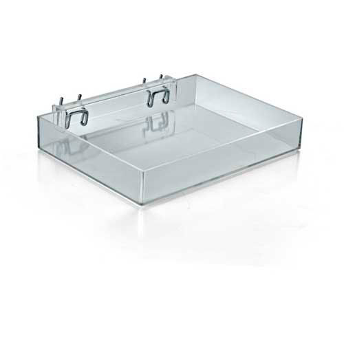 Pegboard or Slatwall display tray measures W x D. This open tray is enclosed on all sides by a edge, preventing product from sliding off the tray. Use this tray on line of pegboard and slatwall displays or on your current display system. This tray comes with 2 Metal U-hooks to attach on any pegboard or slatwall system.