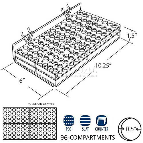 Wide High 6" Deep Cosmetic Display with 96 Round Compartments. Each compartment measures .5" in diameter. For use on countertops, pegboard or slatwall. 2 plastic hooks attached for easy mounting.