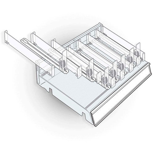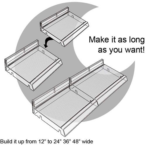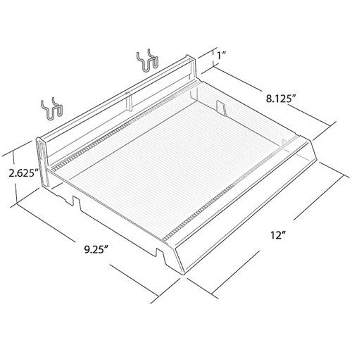 This modular cosmetic tray is W x D x H. These trays can connect to each other to create a customized cosmetic display of any size. There are three interchangeable dividers that can be used in these trays. The end and center dividers are both 1.125" W x 7.5" D. The other divider is a spring-loaded pusher track. It is 0.75" W and it has 6.75" of usable space. These spring-loaded tracks have a panel that is 2.25" H in the front (that is pushed back when the track is filled with product). These spring-loaded holders are perfect to hold mascara, nail polish, or any other small item. C-channel options are available. . For use on counter, pegboard or slatwall. Includes 2 metal U-hooks.