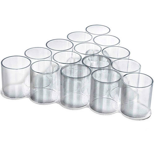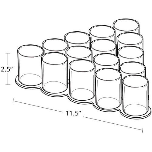 15-cup triangular display measures 11.5"W x 2.5"H. Each cup measures 2.5"H and 2" in diameter and sits on a clear base. Use this display as a freestanding counter unit.