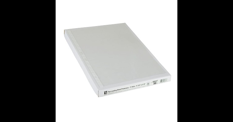 Standard weight polypropylene means durable storage for documents and reference materials. Acid-free protection with polypropylene means no photocopy transfer. Top loading sheet protectors provides permanent storage for your materials. No sheet punching is necessary thereby keeping your documents in their original condition. Thickness: Standard. 50 sheet protectors per box. 11 3/4" x 8 1/4" top loading sheet protector accepts A4 size documents. Fits standard three-ring binder. Nonstick, clear polypropylene won't lift print from inserts.