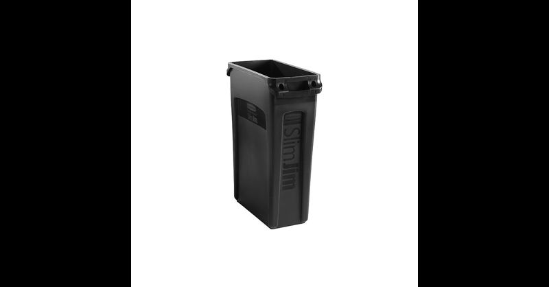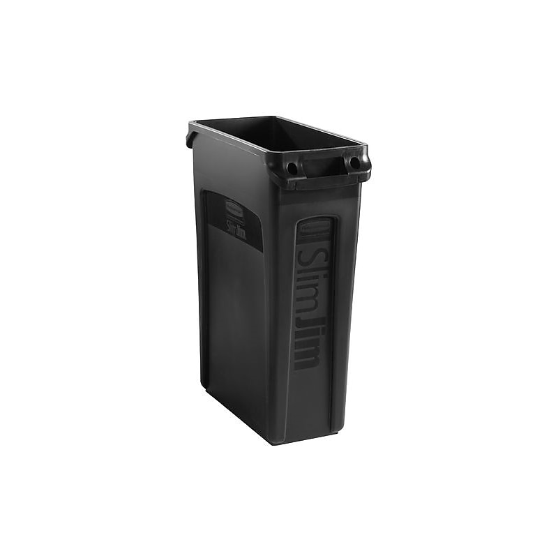 Throw away trash easily with this 23-gallon container. The vented design allows for simple insertion and removal of can liners, and the sturdy handles at the base and rim make it easy to lift and empty contents. This Rubbermaid Slim Jim vented container is made from high-qualityresin for enhanced durability and features a rib-strengthened rim for crush resistance. Trash can without lid ensures clean and litter-free space. Capacity of gal. for large amounts of trash. Made ofheavy-duty plastic to offer long-lasting use. Dimensions: 30"H x 11"W x 22"D. Handles for easy lifting. Venting channels reduce the force needed to lift each trash bin. 1-year manufacturer limited warranty. Keep clutter and trash to a minimum with this Rubbermaid Slim Jim 23-gallonvented container.
