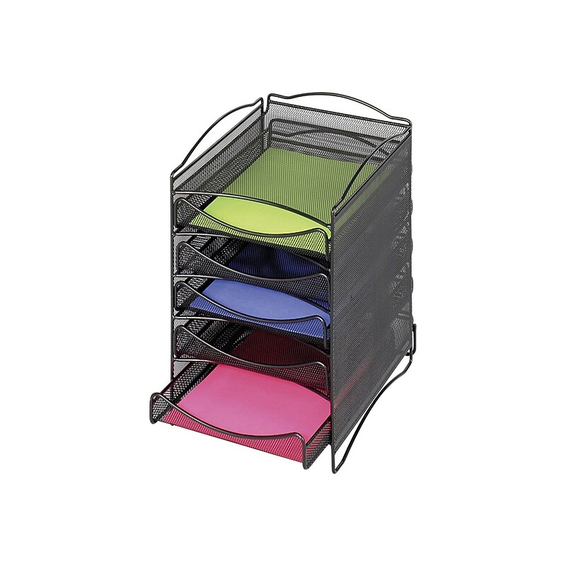 Keep important paperwork and supplies close at hand with this mesh literature organizer. The five pullout drawers offer ample storage for stacks of paper, notebooks, and other office essentials, while the mesh construction offers a clear view of items stored inside. With a stackable design and included connector clips, this Safco mesh organizer works with additional units to create a high-capacity storage system. File organizer is great for keeping your desktop neat and tidy. Comes and made of steel. Dimensions: 15. 25"H x 10. 25"W x 12. 75"D. Features five compartments that can easily store and organize files. Stackable for customized storage. Holds letter-size papers. Organize paper, incoming mail, and other documents with this Safco Onyx five-drawer mesh literature organizer.