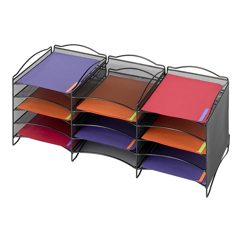 Locate important items in a hurry with this literature organizer. Featuring 12 compartments, this organizer makes it easy to categorize important file folders, medical charts, and other materials, while the sturdy mesh construction provides increased durability. This Safco Onyx literature organizer includes connector clips for convenience and comes fully assembled, making it easy for you to start tidying up the workspace quickly. File organizer is great for keeping your desktop neat and tidy. Comes and made of steel for durability. Dimensions: 11. 25"H x 30"W x 12. 75"D. Features 12 compartments that can easily store and organize files. Stackable for customized storage. Holds letter-size papers. Categorize files, magazines, and other materials easily with this Safco Onyx 12-compartment mesh literature organizer.