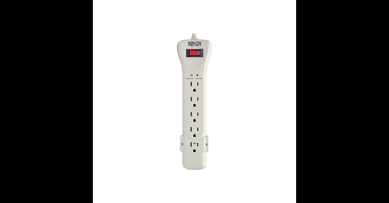 Shield electronic devices or equipment from power spikes with this lightsurge protector. Two outlets are positioned on the side to accommodate three transformers without blocking the five surface outlets, while the power switch controls every connected device simultaneously. A diagnostic LED indicates active grounding status, while the 15-amp circuit automatically shuts down if protection is impaired. The 7-foot power cord allows flexible placement of equipment or workstations, and keyhole slots in the plastic housing enable mounting on a wall or desk. This Tripp Lite Protect It! surge protector suppresses excess electric current up to 2160 joules, while EMI and RFI interference is filtered to avoid data loss or damaged hardware. Surge protector provides 2160 joules of protection for both home and office electronics. Features seven power NEMA 5-15R outlets. Dimensions: 1. 54"H x 2. 72"W x 10. 3"D - Cord length: 7'. AC 120 input voltage. Meets or exceeds cUL, UL 1363, RoHS, UL 1449 Third Edition, and IEEE 587 standards. EMI/RFI noise filtering reduces line noise that can cause data loss and keyboard errors. Comes in light gray. Lifetime manufacturer limited warranty. Comes in gray/silver. Lifetime manufacturer limited warranty. Block excessive voltage to preserve electronics with this Tripp Lite Protect It! seven-outlet 2160-joule surge protector.