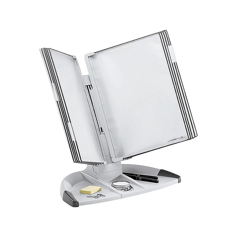 Keep regularly referenced documents handy with this desktop reference system. The 10 included pockets allow for convenient subject categorization, so you can locate information quickly, and the reinforced pocket design offers enhanced sturdiness. This Tarifolddesktop reference display starter set comes with a stable base, helping the display stay firmly in place even when flipping through pages quickly. Contemporary poly stand features compartments for sticky notes, pens, cell phones, paper clips and more. One piece wire-reinforced polypropylene display pockets with snap-on divider tabs holds letter size paper. Document holder with 10 display panels, displays up to 20 pages. Display pockets are rigid but flexible enough to insert and remove documents easily. Designed for documents that measure 8. 5"W 11"H. Manufacturer's 10-year product warranty. Access frequently needed information easily with this Tarifold 10-pocket desktop reference and display system.