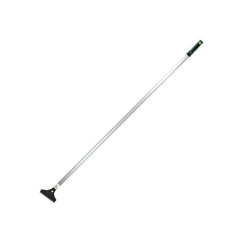 Remove debris from baseboards, floors, or any hard-to-reach surface with this scraper that includes a 4-foot aluminum handle. Featuring a 4-inch angled zinc alloy blade, this scraper cuts through gum, wax buildup, and other stubborn substances. This Unger long-handle scraper has an ergonomic grip with a hang hole for secure use and easy storage. Scraper for light-duty jobs. Dimensions: 48"L. Lightweight scraper with an ergonomic silver aluminum handle, green grip, and hang hole. angled zinc alloy blade. Good for scraping gum, stickers, and wax, etc. Clean floors comfortably with this Unger 4-inch long-handle scraper.