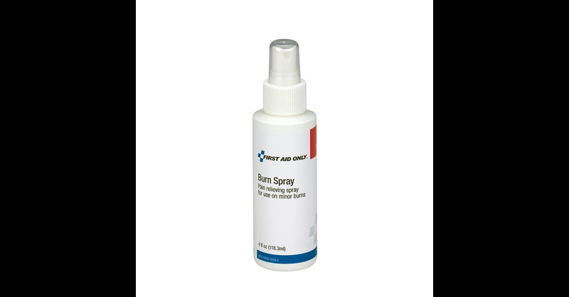 First Aid Burn Spray, 4 Oz. Pump Bottle, Case Of 12. First aid/burn pump spray. It comes in 4-ounces pump spray bottle. General use first aid spray that helps to soothe burns. Perfect for standalone first aid or as a refill for a kit. Water soluble and non-staining. Case of 12. Safety Data Sheet . Medicated spray to help relieve pain from minor burns.