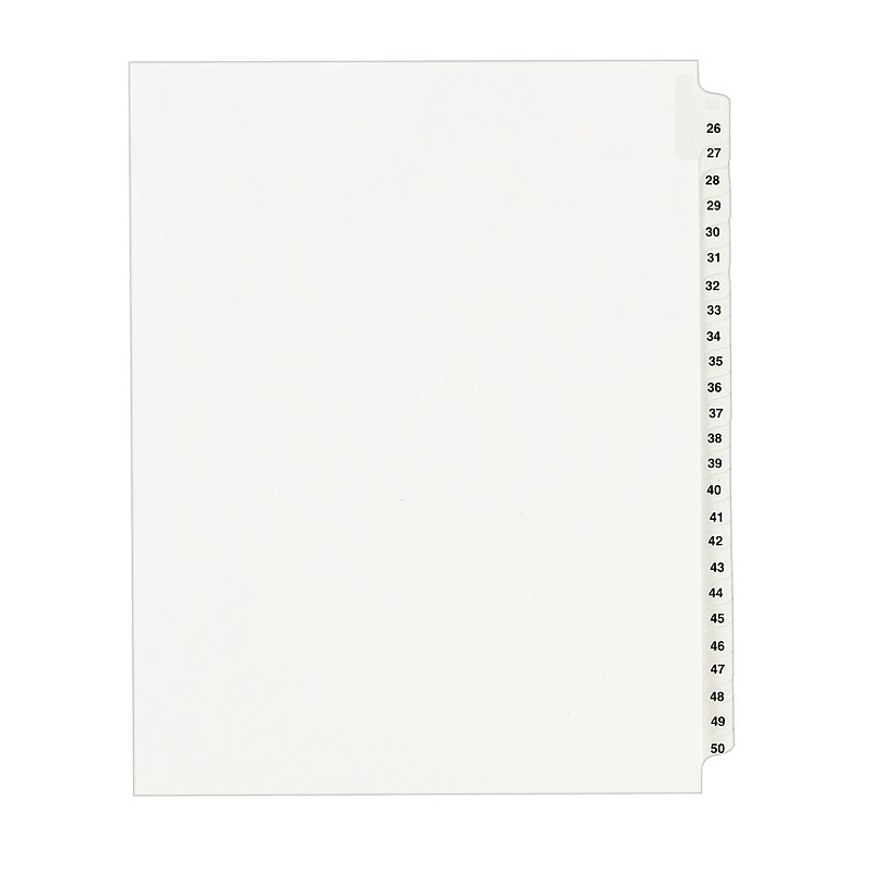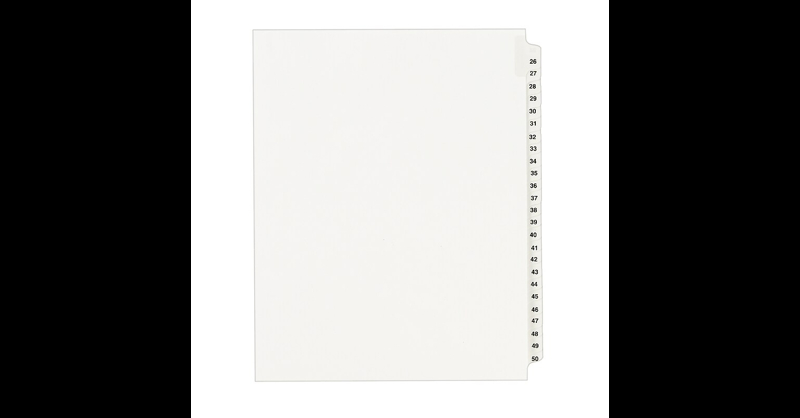 You have the right to organized and professional-looking files. This Standard Collated Legal Divider Set features Tabs 26-50 so it's perfect for index briefs, legal exhibits, mortgage documentation files and more.paper stock with clear, Rip Proof(TM) reinforced tabs are preprinted on both sides using Helvetica bold type for ease of use, and the unpunched binding edge gives you the freedom to fit practically any binding system. Here's evidence these dividers will do your files justice. Perfect for Index briefs, legal exhibits, and mortgage documentation files. Unpunched binding edge so indexes can fit practically any binding system.paper stock dividers feature clear RipProof reinforced side tabs. Side tabs are printed with Avery Style (Helvetica Bold typestyle) on both sides. Letter Size, 26-50. Subdivide complex files with this set of Avery standard letter-size 26-50 tab collated legal dividers.