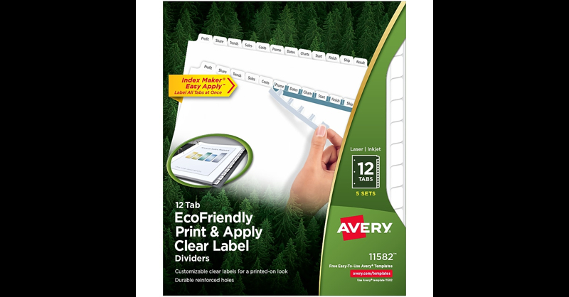 Easily create print shop quality personalized binder dividers with tabs while staying environmentally-friendly with Avery EcoFriendly Index Maker Clear Label Dividers. Made from 100% post-consumer recycled paper, these 3 ring binder dividers with tabs are a great addition to your medical office supplies, school binders, personal organizers, tax office supplies, presentation reports and more. Customize the title tabs for your dividers quickly and easily using the free templates on the Avery website and print with your inkjet or laser printer for clean, professional looking results in minutes. This pack comes with 5 sets of 12 tab dividers, and the Easy Apply clear label strips make it simple to apply all 12 labels of each set at once. Just print, align labels against tabs, smooth down labels and peel up strip. Each 3-hole punched durable divider also features doubled-sided, reinforced tabs and edges to help resist tearing for long-lasting, everyday use. Print, peel, and press your way to a perfect, precise project. Eco-friendly tabbed dividers are made from 100% recycled paper and feature doubled-sided reinforced tabs and edges for extra durability. Save time and money by creating your own high-quality custom tab dividers using free templates from the Avery website and printing on your laser or inkjet printer. Label all 12 tab dividers at once with the Index Maker Easy Apply Label strip that results in five perfectly aligned sets of tabs. Get a professional, printed-on look with clear labels that virtually disappear on thedivider tabs. Great for organizing your medical document binder, meeting materials, proposals, tax organizer binder, financial planner and more. Tab dividers let you organize projects, personal documents, and more. White in color and made of paper. Dimensions: 8. 5"W x 11"L. Three-hole punched and ready for use. They are sold as five per pack. Tear-resistant for safe keeping. Create customized tabs fast with these Avery EcoFriendly Index Maker clear label dividers.
