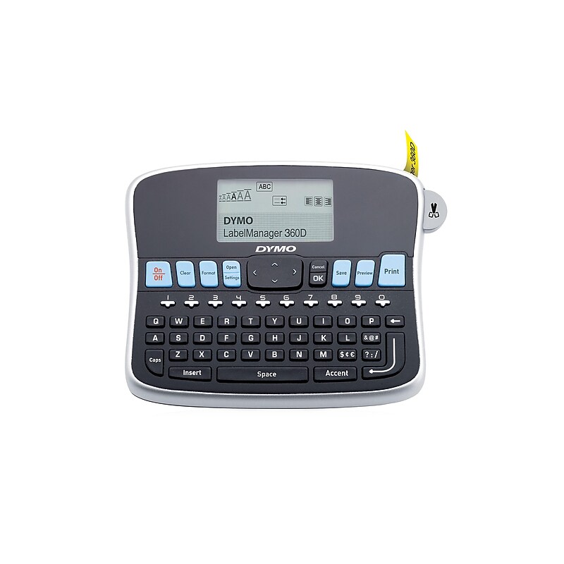 Print labels with this handheld label maker. A standard QWERTY keyboard allows for quick text entry, while a large, two-line graphical display lets you view clear images. Take advantage of special function keys to access punctuation marks, currency and other special symbols easily. Users can choose from seven font sizes, seven text styles, three font styles and eight boxes for customization. This Dymo LabelManager handheld label maker comes with a fast-charging lithium-ion battery for portability and convenience. Label maker for quick organization of items and documents. Maximum print speed up to 0. 47 ips for enhanced productivity. Offers printing with 180dpi maximum resolution. Thermal transfer printing technology eliminates the need for ink. Uses D1 tape up to 0. 75" wide. Choose from seven font sizes, three font styles, and seven text styles for user convenience. Dimensions: 2. 8"H x 7. 76"W x 5. 91"D. Runs on lithium-ion battery. 1-year manufacturer limited warranty. Package includes 1 LabelManager 360D Label Maker, D1 Starter Label Cassette,on white 3/4" x 10', Rechargeable Lithium-ion Battery, Quick Reference Guide & charging Adapter. Design striking labels with this Dymo LabelManager 360D handheld label maker.