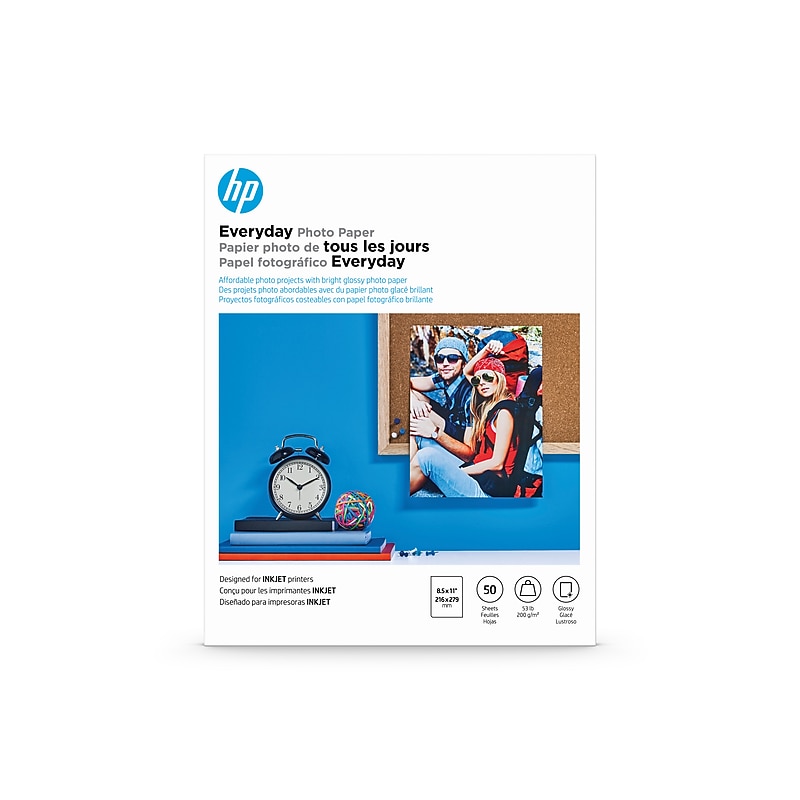Print vivid, striking documents with this everyday photo paper. With 50 sheets per pack, this paper is ideal for creating invitations, printing off multiple memories, and producing other photos, while the quick-drying design helps prevent streaking and smearing. This HP Everyday photo paper delivers great results with almost any inkjet printer and comes with a gloss finish, giving images a sleek, sophisticated appearance. Use glossy photo paper to print out high-resolution black-andor color photos. Dimensions: 8. 5"W 11"L, 216 279 mm. Comes with 0. 2mm thickness that ensures long-lasting and professional quality photos. Utilizes inkjet printing technology to print precise text and images. Nonperforated paper. Non acid-free. 50 per pack. Create clear, vibrant prints with this HP Everyday 8. 5 11-inch gloss-finish everyday photo paper.