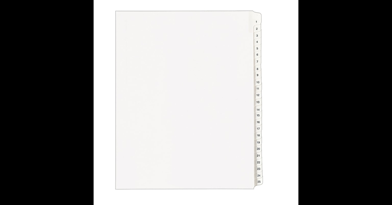 Quickly sort piles of legal documents and notes alphabetically with Avery 01701 1-25 legal exhibit dividers with Allstate-style design. Printed in numerical order with one number per tab, each tab is also printed on both sides for better visibility as you flip through your documents. The font of each tab is printed to match the Allstate style with Helvetica regular type. Avery dividers feature tabs reinforced with clear Rip Proof technology that ensures that the tabs can survive everyday wear and tear. Unpunched for universal compatibility, the binding edge is left intact so that they can be hole-punched to fit with any binding system. 1 set of 25 dividers is included. Whether you are an office admin maintaining a system of records, an attorney keeping track of notes or a paralegal organizing vital documents, Avery dividers are just the right supplies you've been looking for to organize your life in style. Organize legal documents with the clean, professional look of Allstate style 3 ring binder dividers. Each durable tab is designed to withstand everyday wear and tear with clear, Rip Proof(TM) reinforcement technology. Compatible with any binder, the unpunched edges can be hole-punched to fit with any binding system. 3-ring binder dividers are a great, professional choice for any office or business. 1 set of 25 divider tabs for 3 ring binders. Browse large documents quickly with these Avery Allstate-style letter-sizepreprinted side-tab 1-25 legal exhibit dividers.