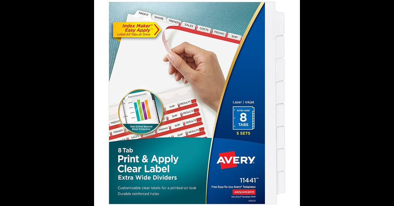 Don't waste time and money ordering custom printed binder dividers with tabs when you can easily create and print your own personalized dividers with Avery Index Maker Clear Label Extra-Wide Dividers. These larger 9. 25" x 11. 25" dividers extend past standard sheet protectors, so tab titles remain visible for quick and easy referencing. Customize your title tabs quickly and easily using the free templates on the Avery website and print with your inkjet or laser printer for clean, professional looking results in minutes. This pack comes with 5 sets of 8-tab dividers for a total of 40 dividers, and the Easy Apply clear label strips make it simple to apply all 8 labels of each set at once. Just print, align labels against tabs, smooth down labels and peel up strip. Each 3-hole punched durable divider also features doubled-sided, reinforced tabs and edges to help resist tearing for long-lasting, everyday use. These 3 ring binder dividers with tabs are a great addition to your medical office supplies, school binders, personal organizers, tax office supplies, presentation reports and more. Print, peel, and press your way to a perfect, precise project. Tab titles remain visible with perfectly-sized extra-wide dividers with tabs that extend beyond sheet protectors. Save time and money by creating your own high-quality custom tab dividers using free templates from the Avery website and printing on your laser or inkjet printer. Label all 8 tab dividers at once with the Index Maker Easy Apply Label strip that results in five perfectly aligned sets of tabs. Get a professional, printed-on look with clear labels that virtually disappear on thedivider tabs. Great for organizing your medical document binder, meeting materials, proposals, tax organizer binder, financial planner and more. Create personalized, professional folders with these five sets of Avery Index Maker extra-wide eight-tabclear label dividers.