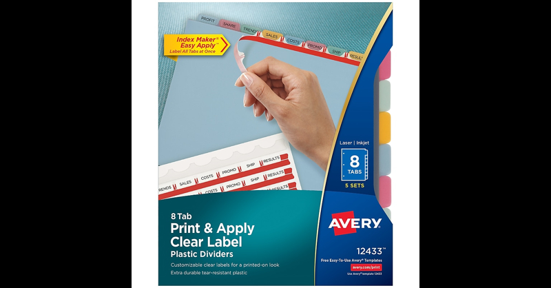 Don't waste time and money ordering custom printed binder dividers with tabs when you can easily create and print your own personalized dividers with Avery Index Maker Clear Label Dividers. Customize your title tabs quickly and easily using the free templates on the Avery website and print with your inkjet or laser printer for clean, professional looking results in minutes. This pack comes with 5 sets of 8-tab dividers, and the Easy Apply clear label strips make it simple to apply all 8 labels of each set at once. Just print, align labels against tabs, smooth down labels and peel up strip. The white binder dividers feature an assortment of colored tabs for eye-catching convenience when you're looking for the right section. Each 3-hole punched durable divider is tear resistant and provides extra strength for long-lasting, everyday use. These 3 ring binder dividers with tabs are a great addition to your medical office supplies, school binders, personal organizers, tax office supplies, presentation reports and more. Print, peel, and press your way to a perfect, precise project. Durable multicolor plastic tabbed dividers are made from tear resistant material durable enough to endure frequent use. Save time and money by creating your own high-quality custom tab dividers using free templates from the Avery website and printing on your laser or inkjet printer. Label all 8 tab dividers at once with the Index Maker Easy Apply Label strip that results in five perfectly aligned sets of tabs. Get a professional, printed-on look with clear labels that virtually disappear on the multicolored divider tabs. Great for organizing your medical document binder, meeting materials, proposals, tax organizer binder, financial planner and more. Design customized tabs in minutes with this 5-set of Avery Index Maker Print & Apply letter-size eight-tab translucent clear-label plastic dividers.