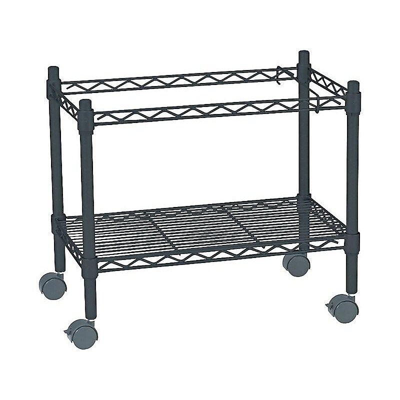 Create a mobile filing system with this Safco one-shelf metal file cart. With space for suspension files on top and a shelf for additional files or materials on the bottom, storing and transporting files is simple. This cart has a 300-pound capacity, allowing for heavy and dense files. Four swiveling wheels make it easy to maneuver this Safcomobile file cart throughout the office. File cart provides an easy way to keep your items organized. Black file cart is made of steel wire with powder coat finish. File cart comes with multipurpose shelf for additional storage. Four dual wheel casters (two-locking) make moving and positioning the cart simple. Dimensions: 20. 5"H x 24"W x 14"D. Assembly required. Supports up to 300 lbs. Meets or exceeds GREENGUARD standard. Manufacturers limited lifetime warranty. This mobile file is extremely functional and versatile with a contemporary look and wire steel construction. Black, steel. Frequent use. The cart is designed to accommodate letter or legal-size hanging folders (not included). You can easily slide the cart under a work surface to open up desk space. Safco Limited Lifetime Warranty . Store and transport files of various types with this Safco mobile file cart.