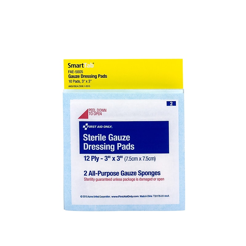 SmartCompliance Refill 3"X3" Sterile Gauze Pads, 10 Per Bag. SmartCompliance Refill keeps supplies organized and stocked with the SmartTab ezRefill system. SmartCompliance refill is used in First Aid Only cabinets:90608, 90580, 90659, 90660, 746000, 746004, 746005, 746006, 90578, 90658, 90732, 90829, 90830, 90831, 90832, 90833, 90834, 90835, 1000-FAE-0103, 1001-FAE-0103, 1300-FAE-0103, 1301-FAE-0103, 1050-FAE-0103 and 1350-FAE-0103. 12-ply, 100% gauze pads. Not made with natural rubber latex. Ideal for cleaning wounds and applying medication or antiseptic. Missing a refill box in your SmartCompliance First Aid Cabinet? Check the schematics in the back of your First Aid Only SmartCompliance cabinet to help select the right refill to order for your cabinet. Perfect as a first aid refill or standalone. SmartCompliance Refill with 10, 3"x Sterile Gauze Pads.