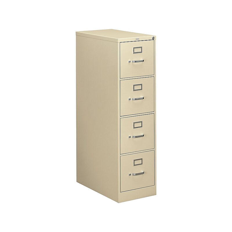 Provide secure, organized storage for important contracts and documents with this four-drawer file cabinet. Removable, interchangeable One Key core locks limit access to authorized personnel, and the high drawer sides easily fit hanging folders without the need for extra handrails. With an all-welded steel frame construction and four vertical reinforcements, this HON file cabinet holds up to rigorous daily use. Four-drawer vertical filing cabinet holds letter-size documents.Beige, Metal. Dimensions: 52"H x 15"W x 26. 5"D. Steel ball bearing drawer suspensions operate easily and quietly. Removable core locks provide added security. Double-walled front kickplate stands up to impact. 26. 5"D cabinet provides 25 filing inches per drawer. Meets or exceeds ANSI/BIFMA/ISTA standards. Product comes fully assembled for your convenience. Four vertical reinforcements keep the cabinet sturdy and the drawers gliding smoothly. Label holders for quick and easy identification of contents. Tilt and slide follower block in each drawer keeps files upright and neat. Lifetime manufacturer limited warranty. Model Option: H314. P. L. Maintain an efficient records management system with this HON 310 Series file cabinet.