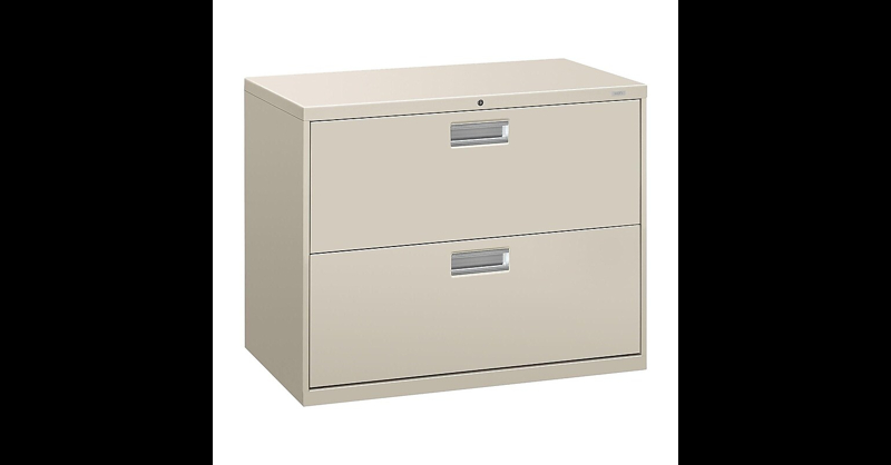 Keep your work space organized with this two-drawer lateral filing cabinet. It has a counterweight and mechanical interlock that keeps only one drawer open at a time for added stability, and leveling glides allow for proper placement on uneven floors. With a two-sided lock mechanism and removable lock core, this HON Brigade 600 series lateral file keeps sensitive documents securely tucked away. Two-drawer lateral filing cabinet holds letter- or legal-size documents. Gray, Metal. 28. 38"H x 36"W x 18"D. Lock included. Built-in counterweight stabilizes the cabinet when a drawer is opened. Meets or exceeds ANSI/BIFMA/ISTA standards. Clean, straightforward design complements panel-based workstations and metal desking. Heavy-duty Steel ball-bearing drawer suspensions operate easily and quietly. Mechanical interlock prevents more than one drawer from being opened at a time, for stability. Radius style drawer handle complements any office environment. Backed by the HON Full Lifetime Warranty. Model Option: H682. L. Q. Keep documents organized and easily accessible with this HON 600 gray two-drawer lateral file cabinet.