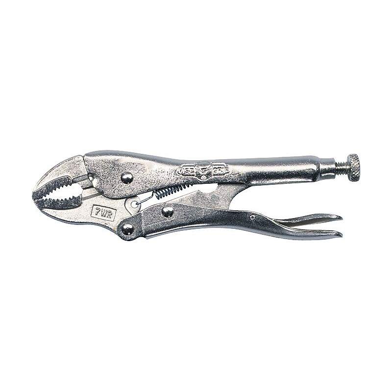 VISE-GRIP Alloy steel curved jaw locking plier is made of alloy steel material for durability. Plier features plain handle for comfort. Type: Curved jaw, locking. Length: 4 in. Cutting capacity: 15/16 in. Handle type: Plain. Material: Alloy steel. Curved jaw puts tremendous pressure on four points of any style nut or bolt head includes convenient wire cutter. Maximum toughness and durability. Guarded release trigger quickly unlocks and protects from accidental release. Adjustable mechanical locking; Turn screw to adjust pressure and fit work. Stays adjusted for repetitive use. Hardened teeth are designed to grip from any angle. VISE-GRIP Alloy Steel Curved Jaw Locking Plier has curved jaws that put tremendous pressure on four points of any style nut or bolt head.
