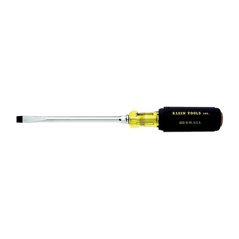 Klein Tools Heavy-duty screwdriver features chrome plated square steel shank and 1/4" wide slotted keystone tip. Screwdriver with cushion-grip handle is 8 11/32" long and has patented Tip-Ident to identify the type of screwdriver/tip orientation. Type: Heavy duty. Tip type: Keystone, slotted. Tip size: 1/4 in width. Length: 8 11/32 in. Shank type: Square. Cushion-grip handle allows for greater torque and comfort. Patented Tip-Ident quickly identifies the type of screwdriver and screwdriver tip orientation; Special heat-treated shafts. Premium chrome plated for smooth feel and corrosion resistance; Precision-machined tip for exact fit. Internal flanges inside handle provide solid, twist-resistant blade anchor. Heavy-duty square shank for wrench-assisted turning; Bolster reinforces shank for hard use. ⚠ WARNING: Cancer and Reproductive Harm - www. P65Warnings. ca. gov. Klein Tools Square Chrome Plated Steel Shank Screwdriver has a precision-machined tip for exact fit.