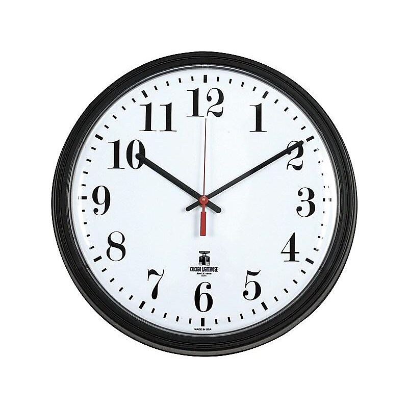 Monitor the time from afar with this easy-to-read, traditional-style wall clock.Arabic numerals complement the white dial, creating a sharp contrast, and the red second hand is easy to distinguish from the black minute and hour hands. Install this clock quickly by using the included hanging hardware. This Chicago Lighthouse Industries Contract black-and-white office clock uses quartz movement powered by a single AA battery (not included) for precise timekeeping. Wall clock in black case. Non-yellowing 12" white dial face. Quartz movement mechanism. Powered by one AA battery (not included). Face features bold, easy-to-read Arabic numerals, black hour and minute hands, and red second hand. Includes hanging hardware. 3-year manufacturer limited warranty. Hanging hardware included. 3-year limited warranty. Made in U. S. A. Requires "AA" battery, not included. Traditional design with second hand makes telling time easy from any angle. Keep accurate time for less than the cost of an atomic clock. Includes hanging hardware. Dial diameter: 12". Overall size: 13-3/4" Dia. x 2"D. Operates on 1 "AA" battery (not included).case. Track time from around the room with this Chicago Lighthouse Industries Contract quartz wall clock.