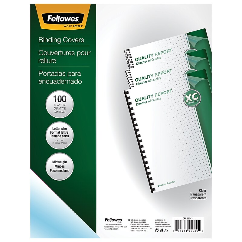 Show off title pages with thefronts on these binding covers. Constructed with sturdy plastic material, these covers keep contents safe from rips, spills, and other damage, while the sleek aesthetic gives presentations and other papers a sophisticated, professional look. These Fellowes Crystals covers have an unpunched design that lets them be easily incorporated into almost any binding or filing system. Presentation covers help you organize office documents. Binding size: 8. 5"W x 11"H. Clear presentation covers are made of polyvinyl chloride/PVC to offer durability. Unpunched covers adapt to any binding system. Square corners provide added protection. Tear-resistant material keeps documents looking good. 100 per pack. Give bound booklets a sleek finishing touch with these Fellowes Crystalsletter-size PVC covers.