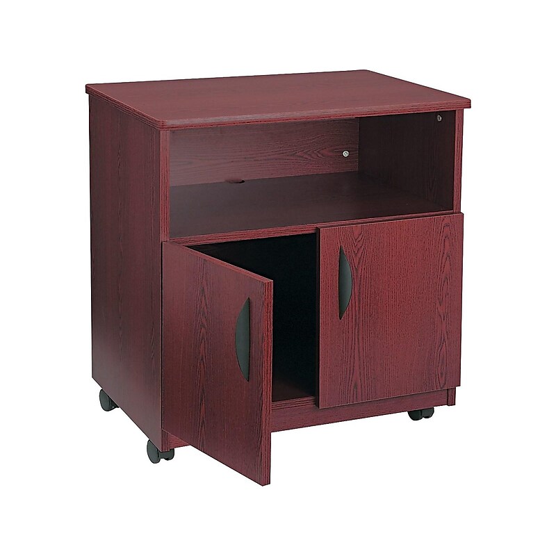 Organize your space with this Safco wood machine stand This stand is a sleek way to store a printer or scanner as well as necessary supplies and materials. With a laminate top, a shelf, and ample cabinet space, there is plenty of room to store an office machine as well as additional supplies. Two locking casters keep this stand in place. The wooden construction of this Safco mobile machine stand gives it a tasteful appearance, perfect for offices. Increase the functionality of your workspace with machine stands. Brown machine stands are made of wood with stain- and scratch-resistant laminate finish. Double doors conceal lower compartment, upper compartment is open. Four swivel casters (two locking) make moving and positioning the cart simple. Dimensions: 30. 25"H x 28"W x 19. 75"D. Assembly required. Supports up to 200 lbs. Has handy cable management that keeps cords under control. Store electronics, machines, and other supplies in this Safco laminate machine stand.